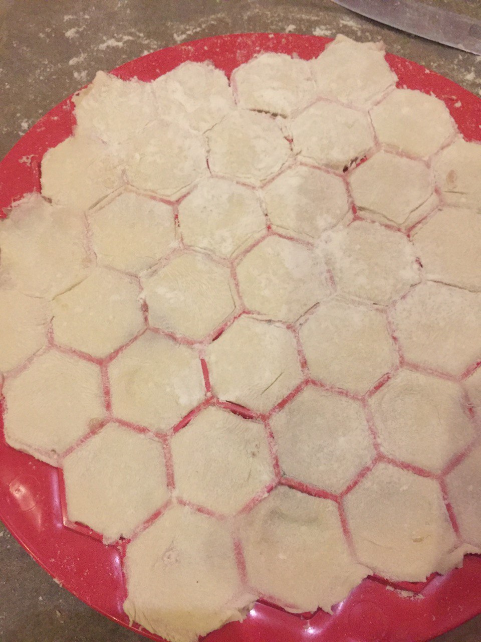 Раскатываем тесто под её размер, клалём, в яцейки накладываем фарш и сверху накрываем вторым куском раскатанного теста и продавливаем и получаем небольшие пельмеши.