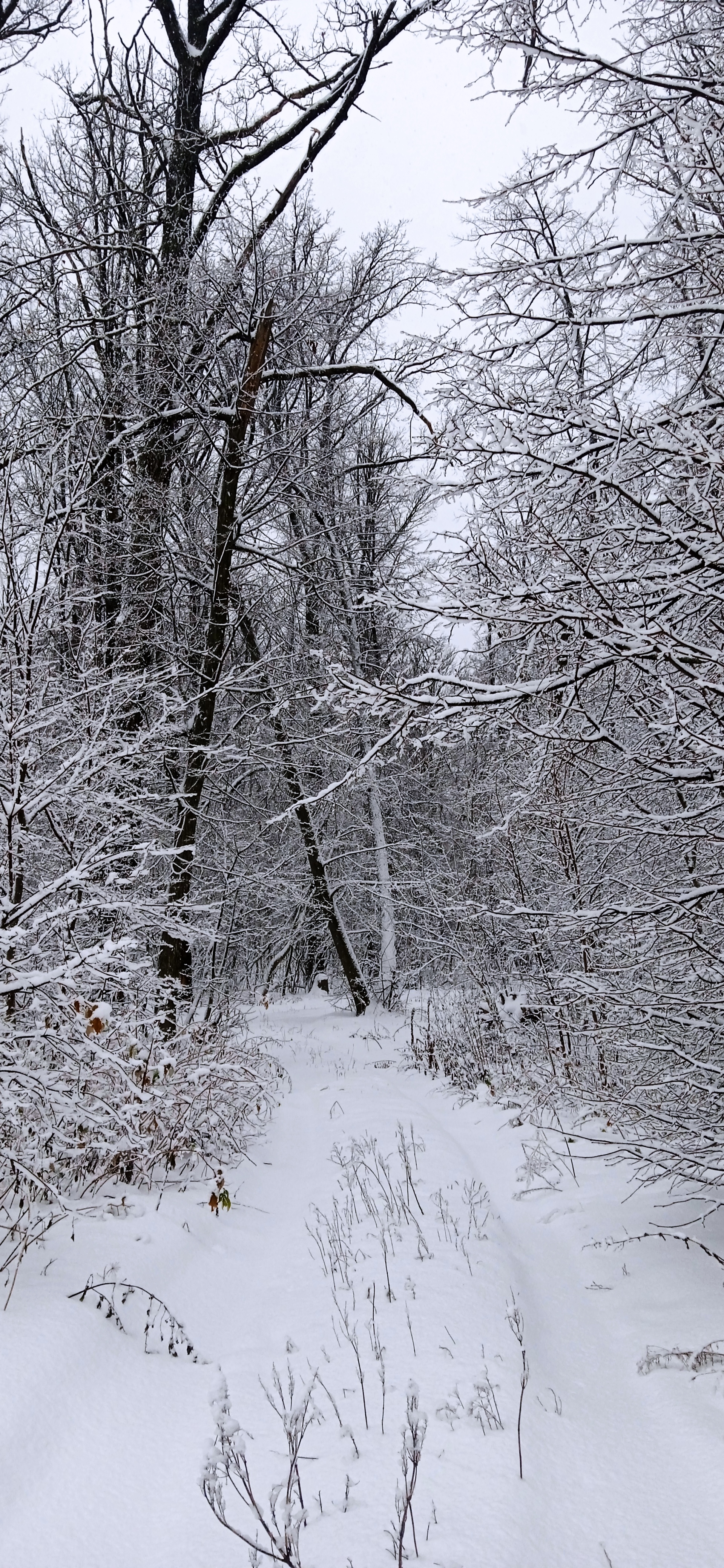 Чуть в стороне, под снегом угадывается тропка человека, но исходя из того что там уже несколько слоёв снежного наста, они далеко не первой свежести.