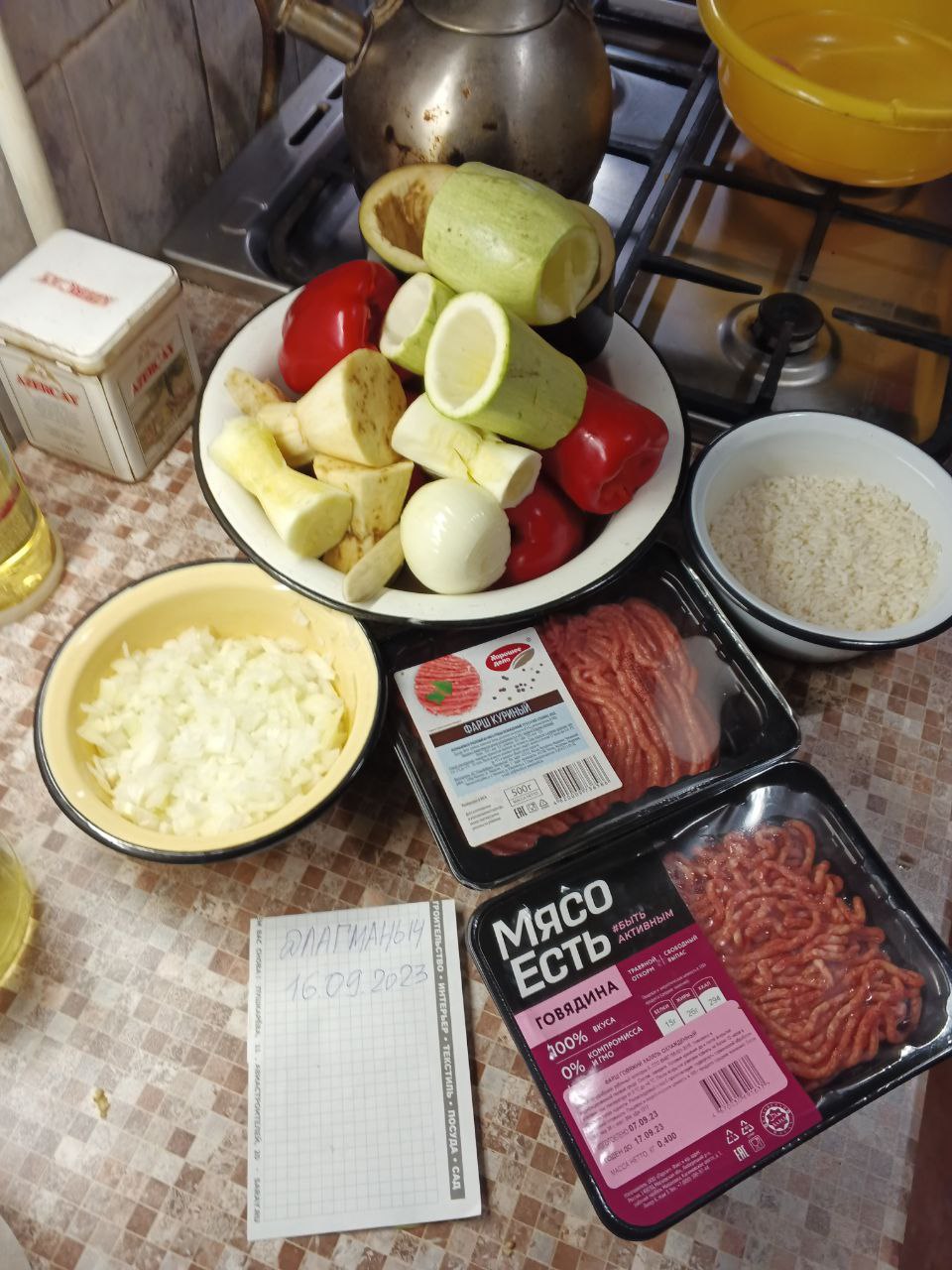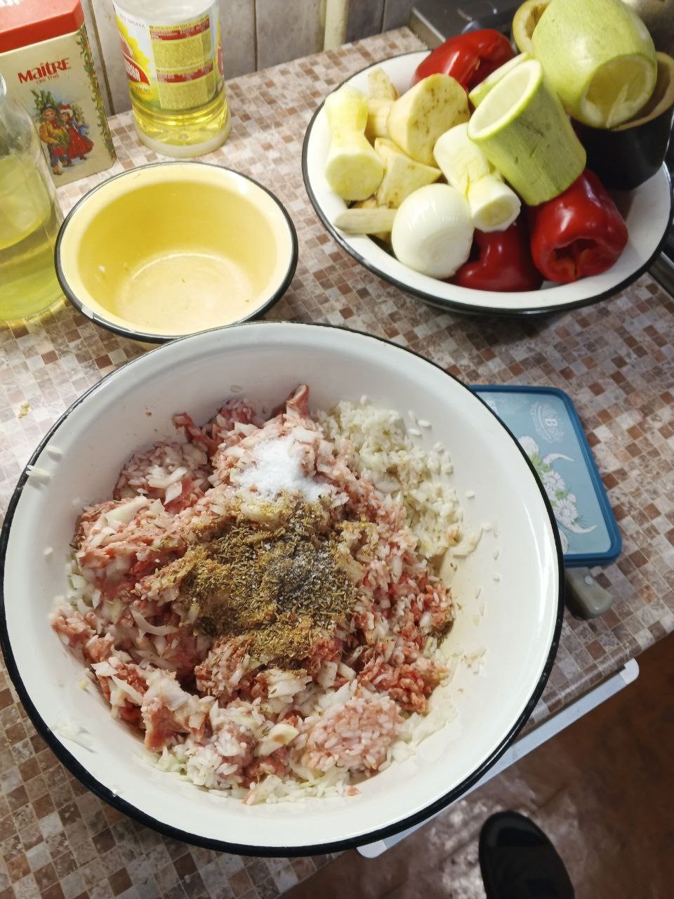 Делаем фарш, фарш готовый брали говяжий и куриный , смешиваем с рубленным луком и замоченный заранее рисом