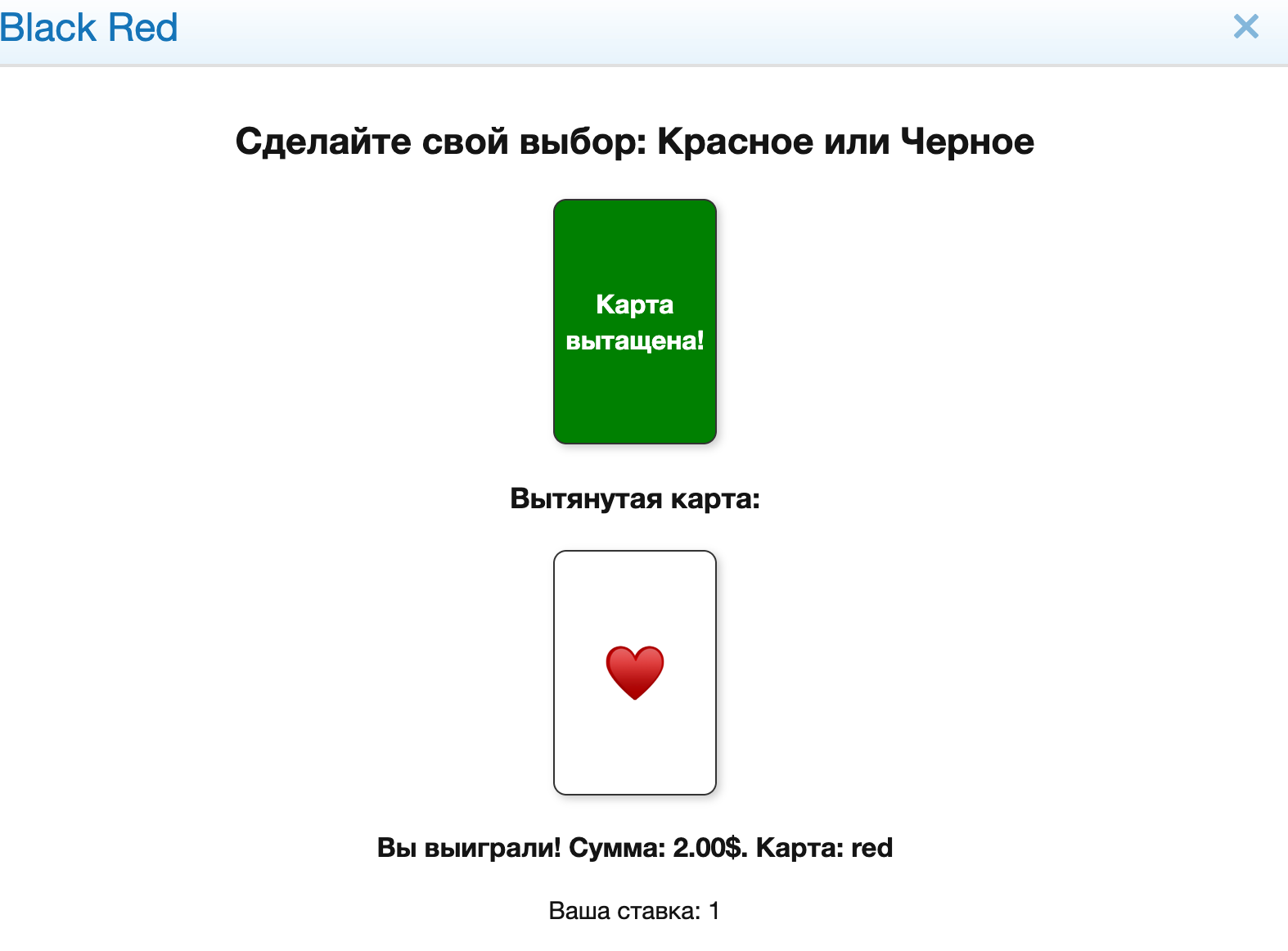 8. После выбора цвета игра автоматически запустится: колода начнёт перемешиваться, и через несколько секунд будет показан результат.
