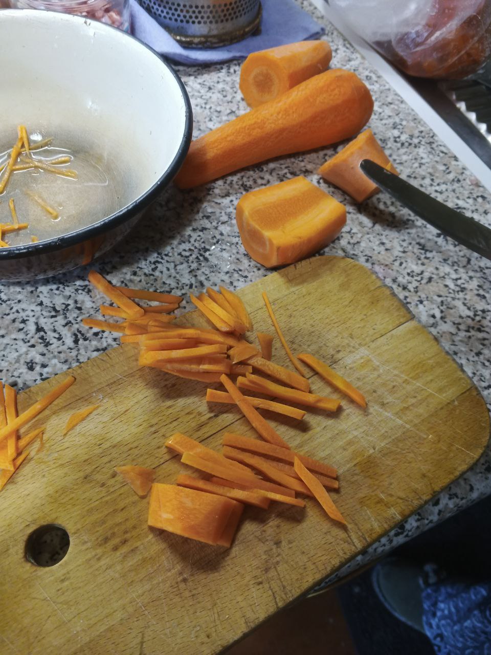 Закидываем на сковороду одновременно нарезанные лук и морковь
