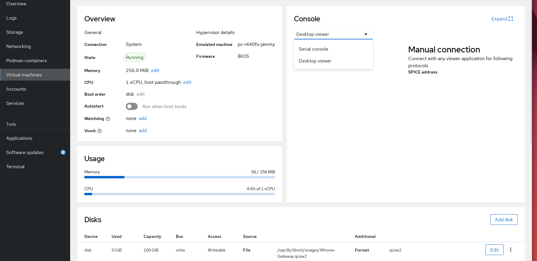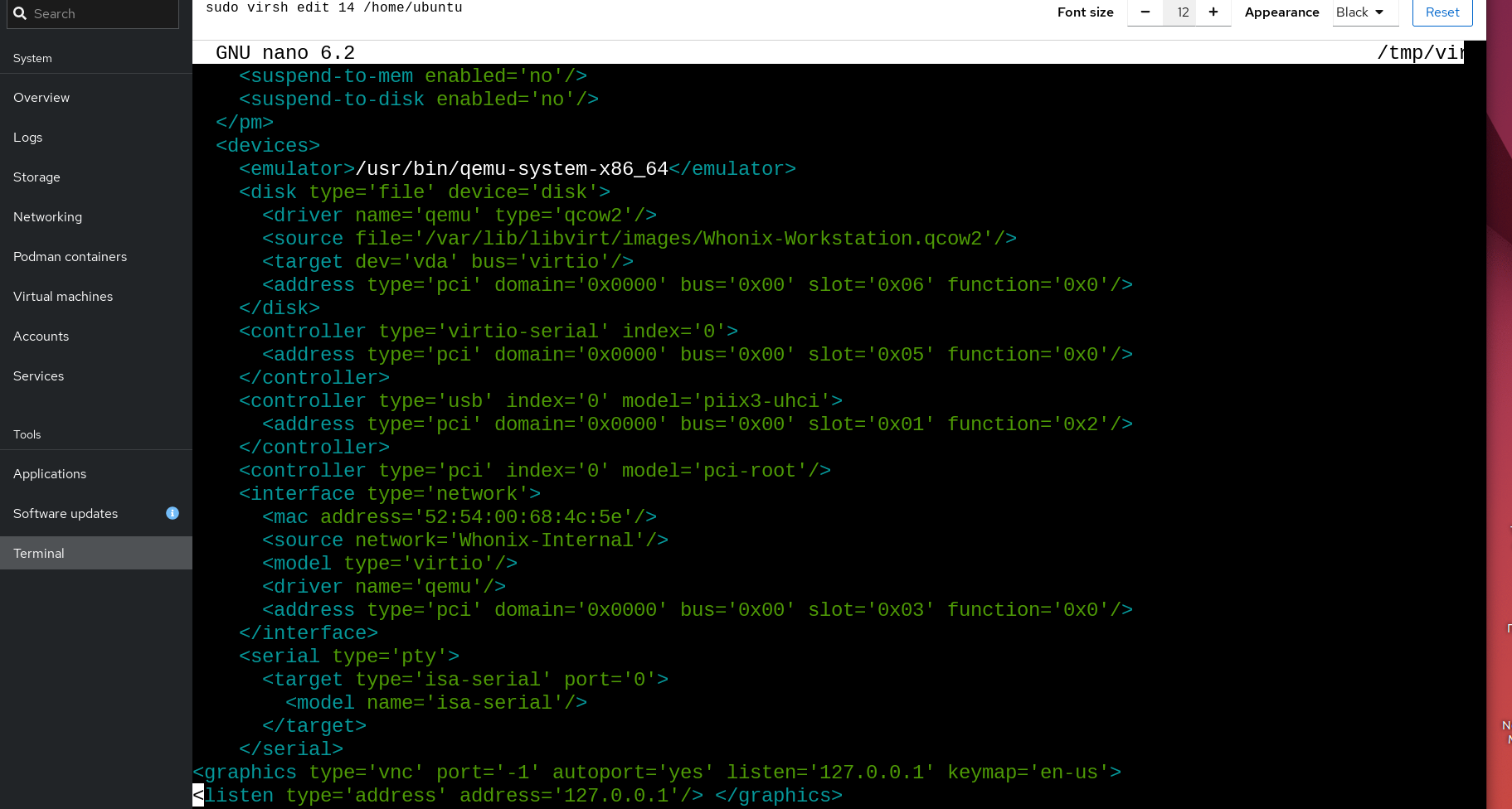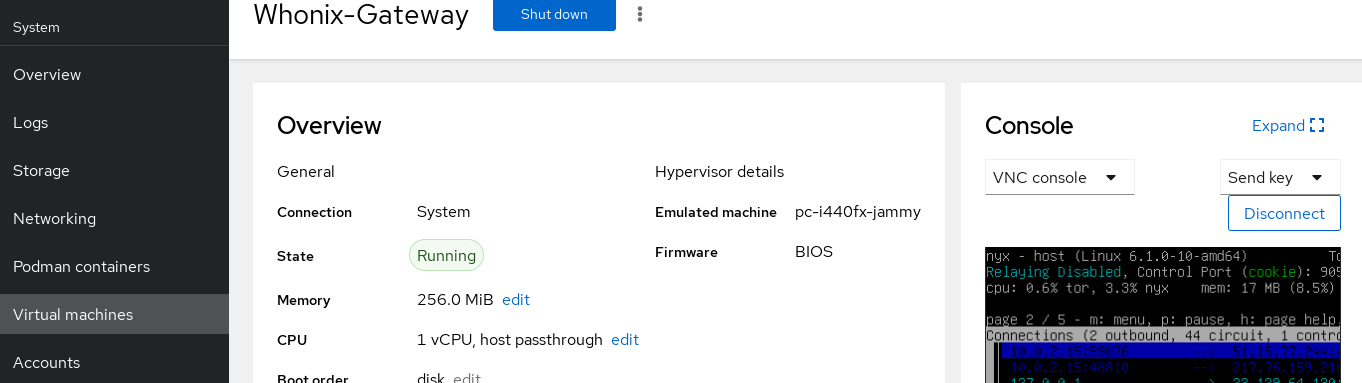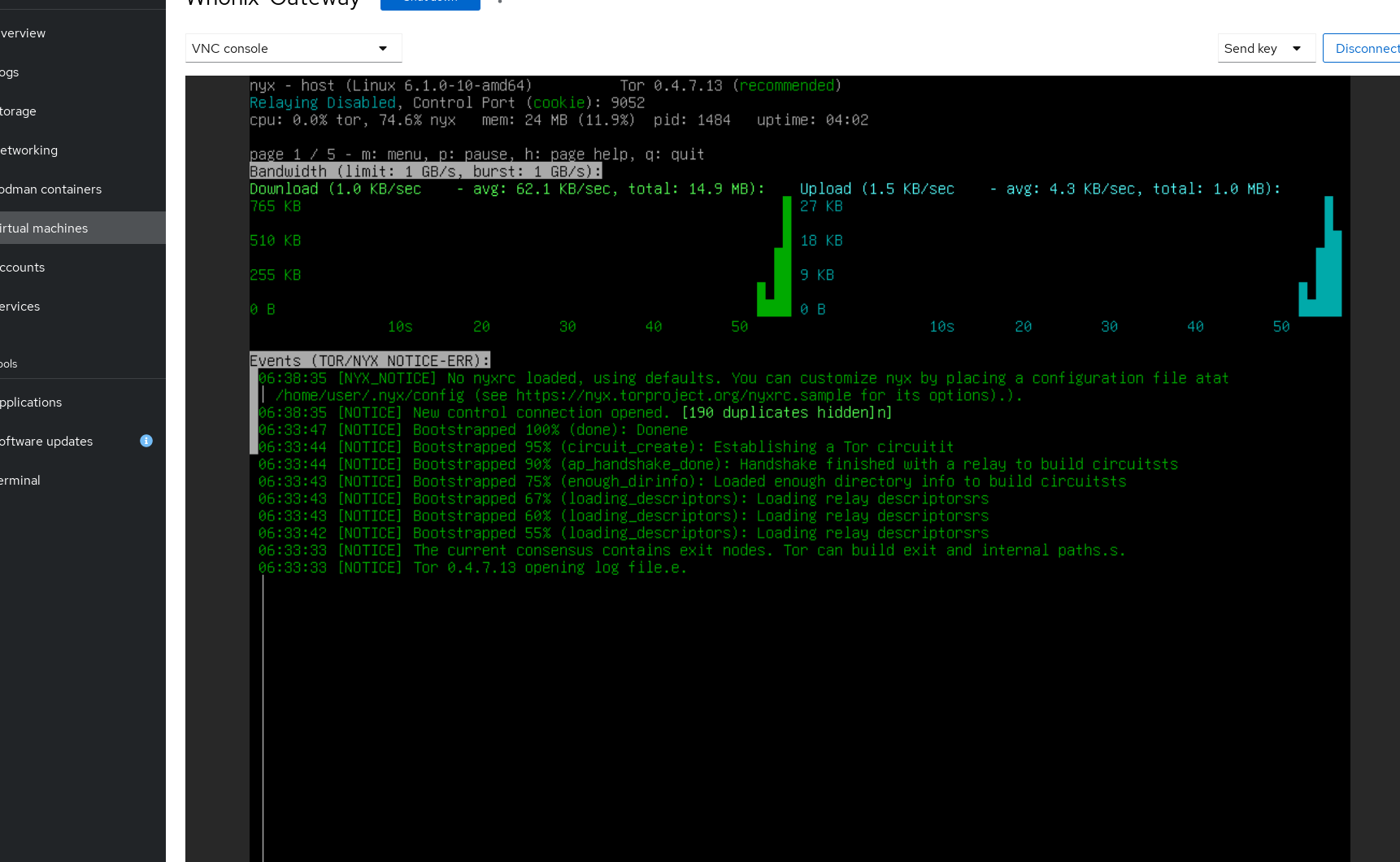В терминале нам будет необходимо установить whonix на kvm с помощью команд. После завершения у нас будут виртуалки во вкладке virtual machines в cockpit. Там уже будет легко управлять ими с помощью кнопок.