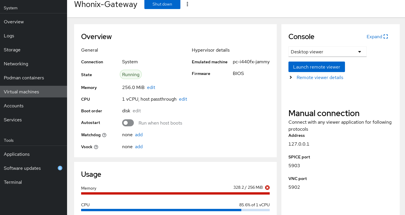 Мы будем использовать выделенный сервер с интерфейсом cockpit, kvm виртуализацией и onion адреса для создания анонимных виртуалок Whonix в сети тор. Подключение к ним будем производить через веб-браузер тор или же путем проброса портов через ssh onion.